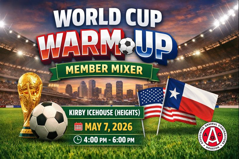 DESCRIPTION:World Cup Warm-Up Member MixerHelp AGC Houston kick off the excitement as our city gears up to host the FIFA World Cup 2026! Join your AGC Houston crew at our World Cup Warm-Up Member Mixer - a networking event you won't want to miss. ⚽🎉Break out your favorite futbol jersey\, show off your team spirit\, and get ready to make some great connections. Enjoy cold drinks 🍻\, good vibes 😎\, and plenty of time to catch up with familiar faces while meeting new industry contacts.Come mix\, mingle\, and build relationships as we warm up to hosting multiple World Cup matches and celebrate Houston as a global soccer destination - and the incredible city we all helped build. 🌎🏗️🎟️ Registration InfoGeneral Contractor Members: FREE (email brenda.r@agchouston.org to register   pre-registration required!)Members: $40/person through May 6thAt the Door: $50/person on May 7th (if space allows   no walk-ins if sold out)Non-Members: $100/personYour registration includes beverages + a raffle ticket! 🍻🎟️🤝 Sponsorship   $700Includes 4 attendeesLogo on website + tabletop signageOption to bring small promo itemsRecognition at the eventSpots will go fast don't miss out on this fun and festive evening with AGC Houston!